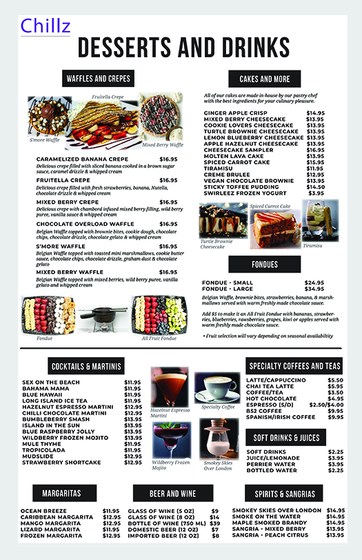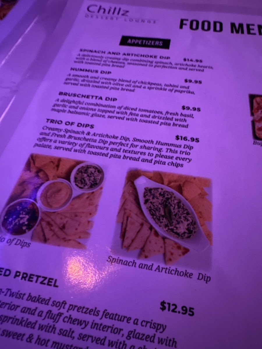 The desserts and drinks are PHENOMENAL! The best desserts and some of the best service I’ve ever experienced. The atmosphere of Chillz is amazing and purely indescribable, you need to come check it out for yourself! I’ve recommended this lounge to countless friends, and will continue to do so. For sure my favourite place in Barrie!