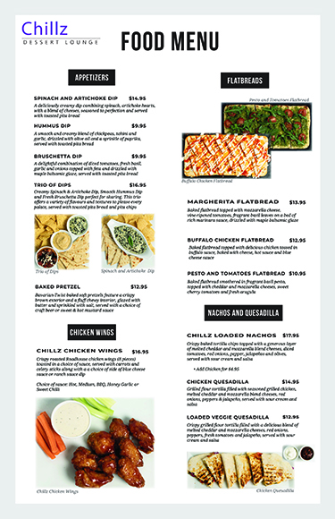 Had an amazing time at the Chillz Lounge! The service was amazing, we had a wonderful server named Julia! 10/10. The place was super clean and the atmosphere was perfect, relaxing and a chill place to unwind, the food was to die for! Would definitely recommend the turtles cheese cake and the fondue.