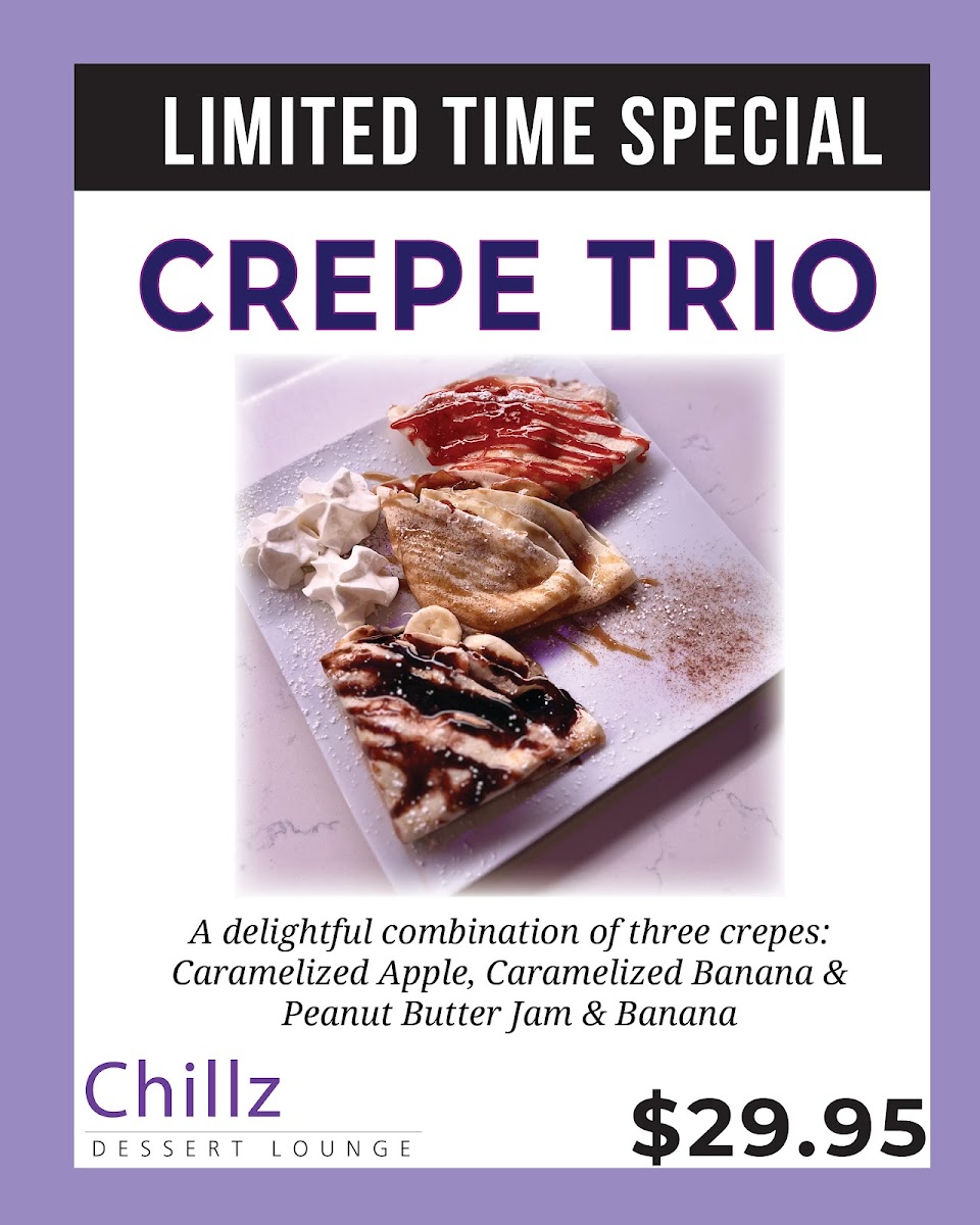 We ate here today during winterfest and it was delicious!! We’ve eaten here a few times and loved it but today we ordered 3 different crepes and shared them and loved all 3. All 3 of us chose the mixed berry as our favourite, the berries were so fresh!! We also had the caramelized banana and fruitella crepes. All were delicious. We had coffee to warm us up and that was good too. The Chillz lounge is really cool inside and has a really good vibe. The man who I believe to be the owner is really nice and friendly. If you’re hungry for a nice dessert this is definitely a place to go! I’ve also had the fruit and marshmallow etc... chocolate fondue and loved it.